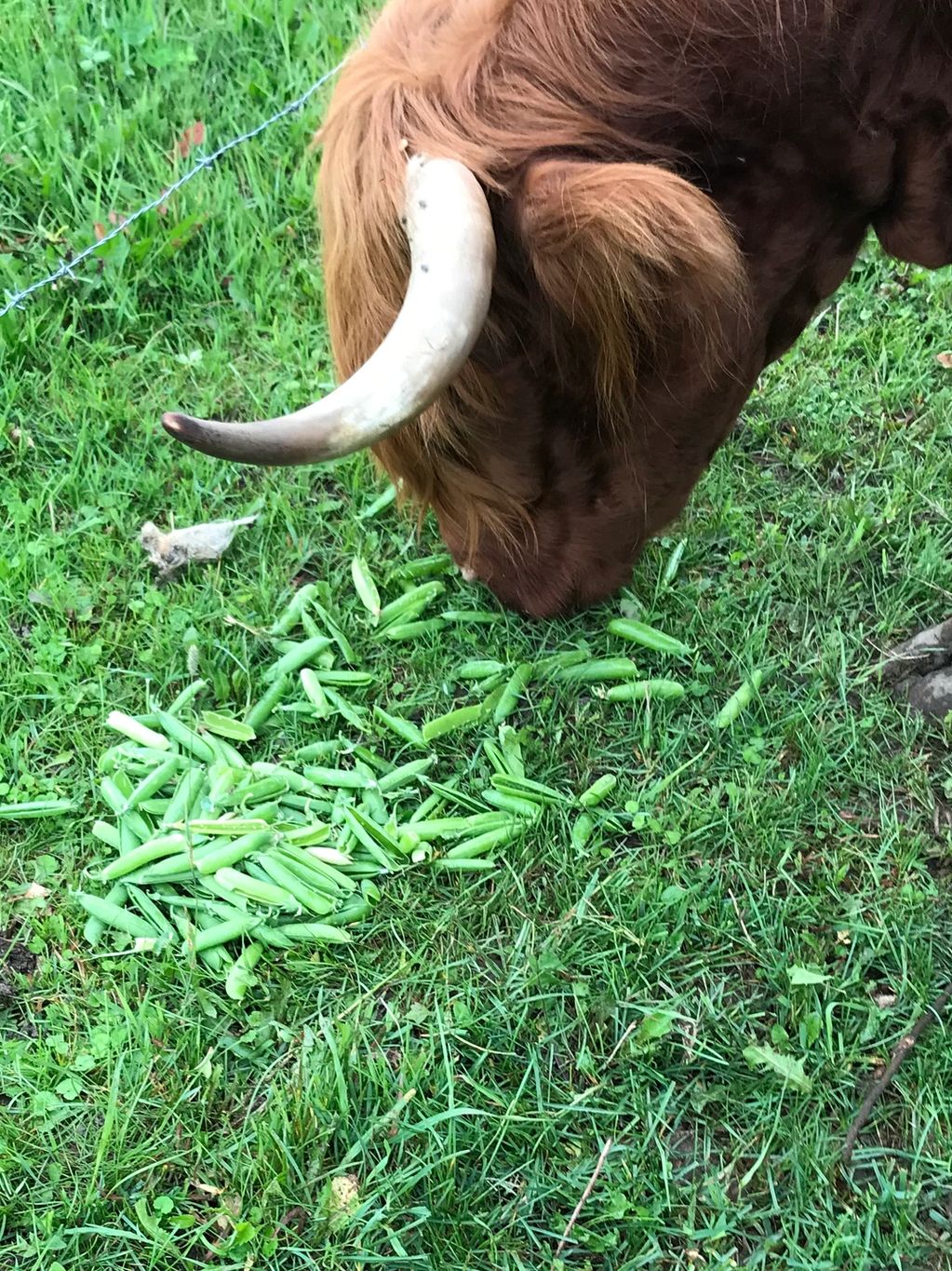 Nos vaches apprécient une petite gâterie de tems en temps. Maya raffole d'à peu près tout ce qui sort de mon jardin: cosses de pois, fanes de betteraves et de carottes, feuilles de navet, de brocoli et de chou-fleur. Quand elle me voit approcher de son parc, elle a pris l'habitude de venir voir si je n'aurais pas un petit quelque chose pour elle.
